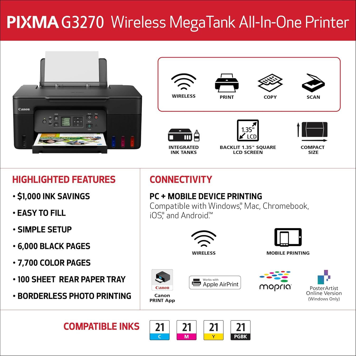 Canon MegaTank G3270 All-in-One Wireless Inkjet Printer. for Home Use, Print, Scan and Copy, Black